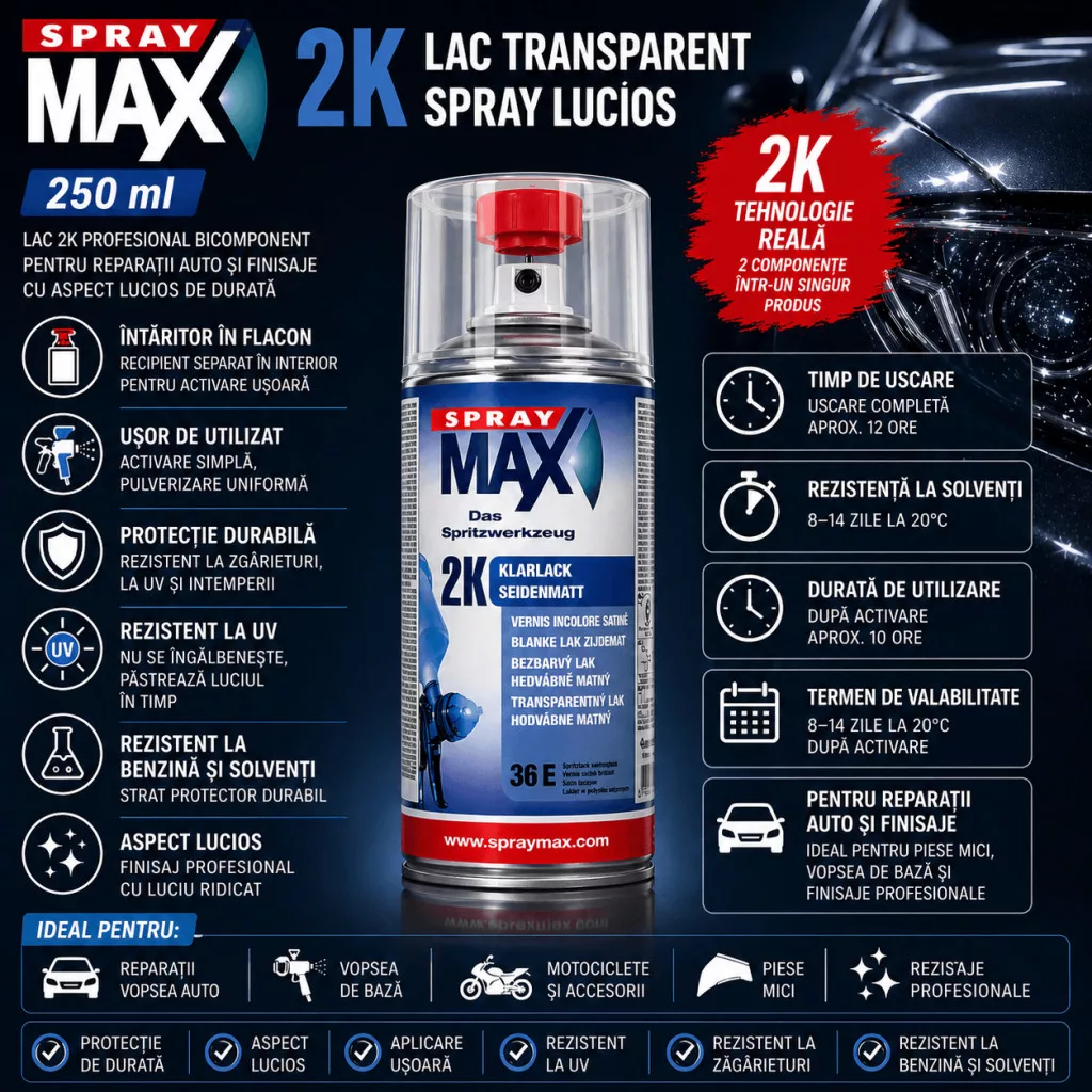 SprayMax 2K lac transparent lucios este un spray profesional bicomponent, ideal pentru reparații auto, protejarea vopselei de bază și obținerea unui finisaj durabil, cu luciu intens.